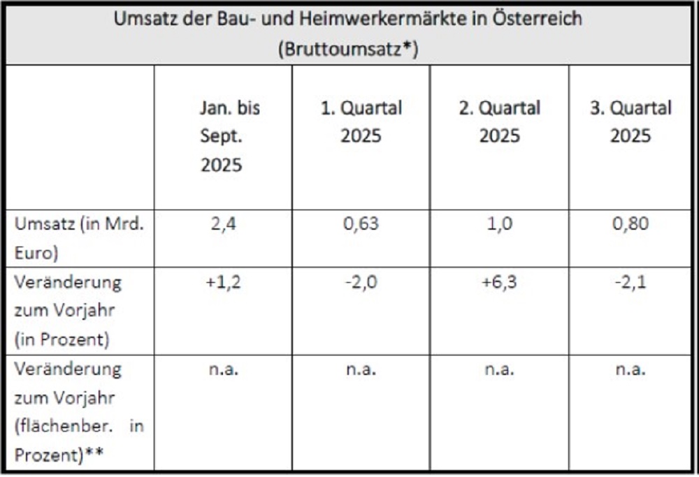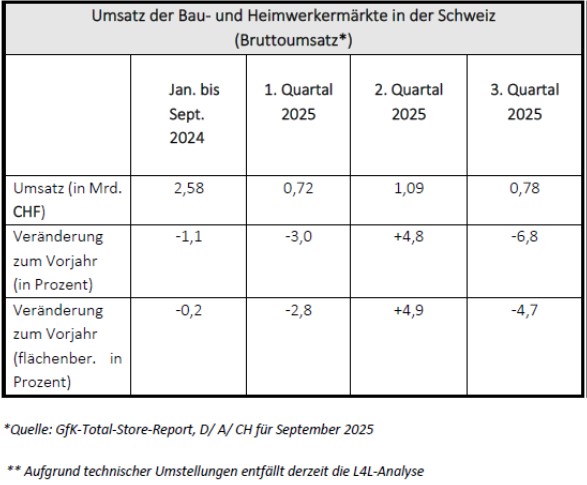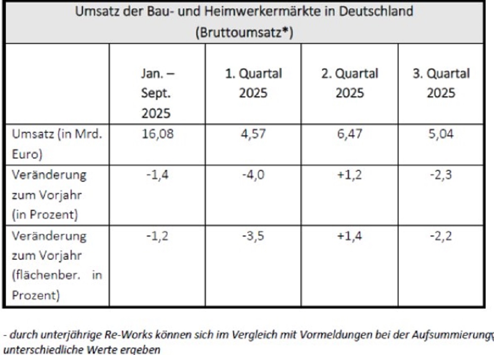 Auch nach drei Quartalen bleibt im Jahr 2025 eine spürbare Trendwende für die Bau- und Gartenfachmärkte aus. Nach einem Zwischenhoch im zweiten Quartal konnten weder Spätsommer noch Frühherbst die entsprechenden Wendepunkte setzen, und obwohl der September wieder ins Positive drehte, blieb das 3. Quartal mit einem Minus von -2,3% hinter dem Vorjahreswert zurück.