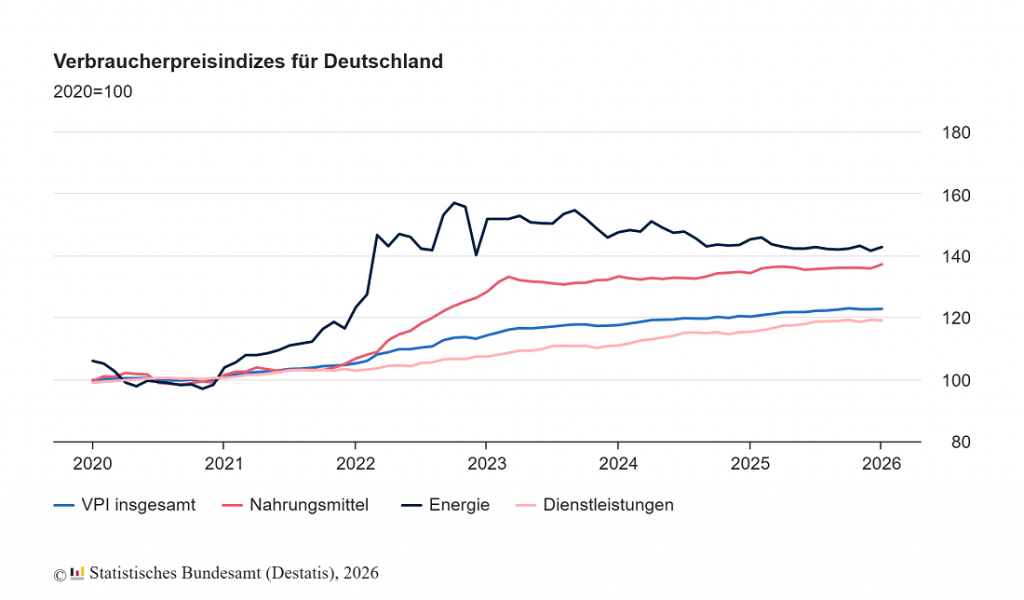 Die Inflationsrate in Deutschland – gemessen als Veränderung des Verbraucherpreisindex (VPI) zum Vorjahresmonat – lag im Januar 2026 bei +2,1 %. Im Dezember 2025 hatte sie +1,8 % betragen und zuvor im November und Oktober 2025 jeweils +2,3 %.