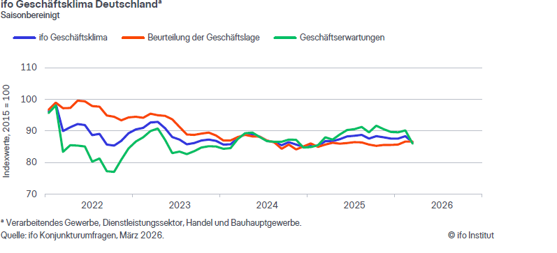Die Stimmung unter den Unternehmen in Deutschland hat sich merklich verschlechtert. Der ifo Geschäftsklimaindex sank im März auf 86,4 Punkte, nach 88,4 Punkten im Februar. Dies war auf deutlich pessimistischere Erwartungen zurückzuführen. Die Urteile zur aktuellen Lage blieben hingegen unverändert. Die Unsicherheit unter den Unternehmen nahm spürbar zu. Der Krieg im Iran beendet vorerst die Hoffnung auf einen Aufschwung.
