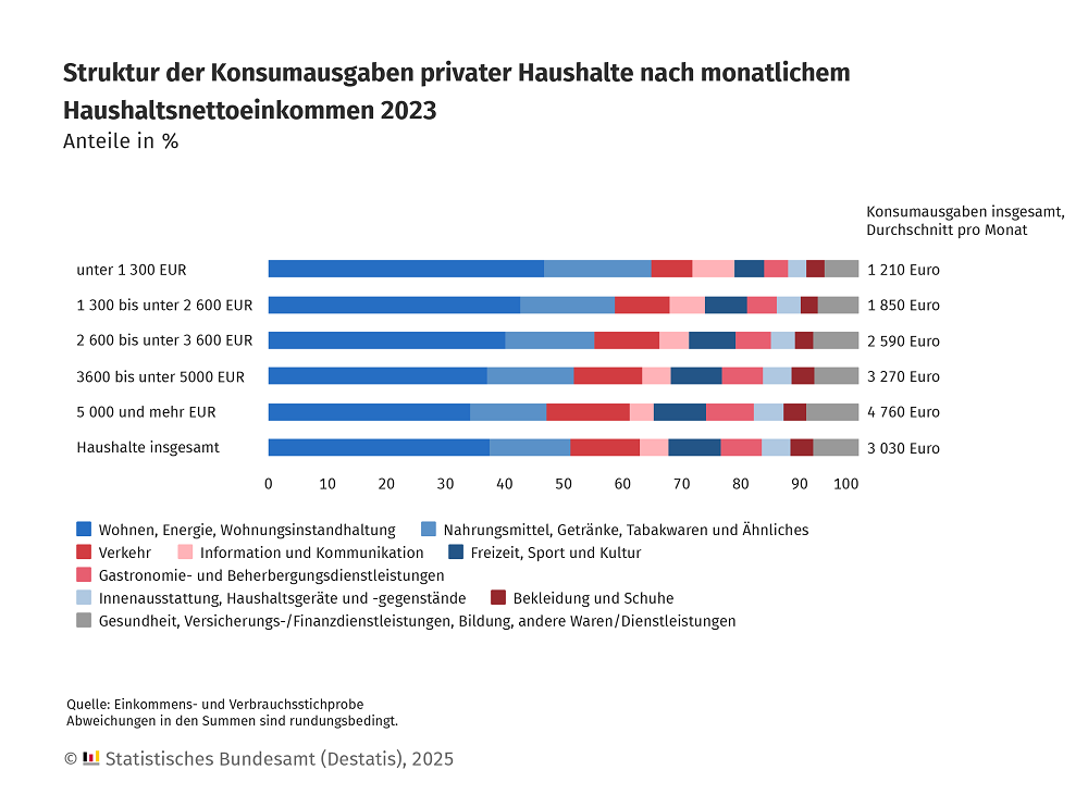 Während Haushalte mit einem monatlichen Einkommen von unter 1 300 Euro im Jahr 2023 nahezu zwei Drittel (64 %) ihrer Konsumausgaben für Lebensmittel und Wohnen aufwendeten, waren es bei Haushalten mit einem Einkommen ab 5 000 Euro weniger als die Hälfte (47 %). Diese Haushalte gaben damit im Jahr 2023 monatlich durchschnittlich rund 2 250 Euro für Lebensmittel und Wohnen aus. Ihre gesamten monatlichen Konsumausgaben beliefen sich auf durchschnittlich 4 760 Euro.