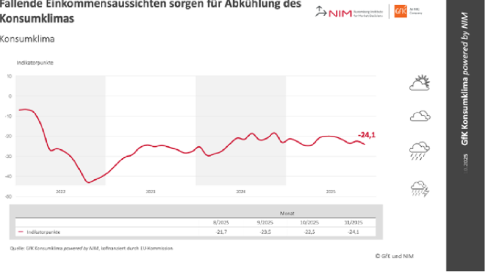 Das Konsumklima setzt seinen Abwärtstrend fort. Hierfür sind die im Oktober deutlich getrübten Einkommenserwartungen der deutschen Verbraucher verantwortlich. Im Gegensatz dazu zeigen sowohl die Konjunkturerwartungen als auch die Anschaffungsneigung leichte Zuwächse. Und die Sparneigung bleibt – wie bereits im Vormonat – nahezu unverändert. Folglich prognostiziert der Konsumklima-Indikator für November 2025 im Vergleich zum Vormonat (revidiert -22,5 Zähler) einen Rückgang um 1,6 Zähler auf -24,1 Punkte.
