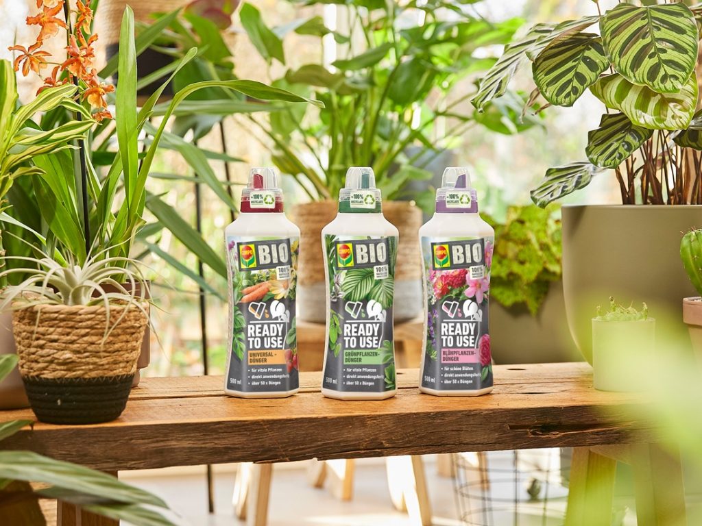 Die neue Linie umfasst drei anwendungsfertige Bio-Dünger, mit abgestimmten Formulierungen für die beliebtesten Kulturen. Der COMPO BIO READY TO USE Universaldünger ist für alle Pflanzenarten geeignet und fördert das harmonische Wachstum und die gesunde Entwicklung aller Pflanzen in Haus und Garten – ideal für den unkomplizierten Einstieg in die natürliche Düngung. Der COMPO BIO READY TO USE Grünpflanzendünger sorgt für vitale, schöne Blätter bei allen Grünpflanzen – von der Monstera bis zum Ficus. Der COMPO BIO READY TO USE Blühpflanzendüngerunterstützt eine gesunde Blüten- und Pflanzenentwicklung bei blühenden Balkon-, Zimmer- und Kübelpflanzen.
