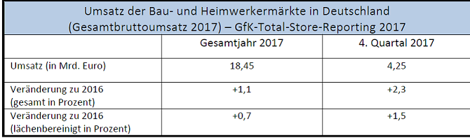 Baumarkthandel in Deutschland erzielt im Geschäftsjahr 2017 Gesamtbruttoumsatz von 18,45 Milliarden Euro und Umsatzwachstum von 1,1 Prozent