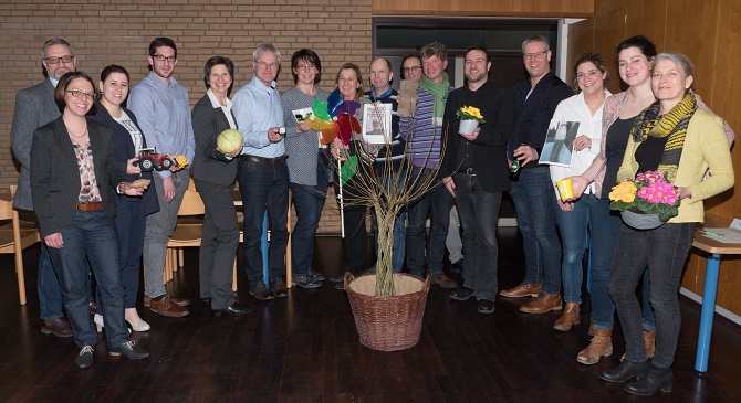 Die Teilnehmer des Marketingworkshops von Agrobusiness Niederrhein zeigen was sie mit dem Niederrhein verbinden. Henning Janßen (5.v.l) zeigte auf was notwendig ist, um eine Regionalmarke zu etablieren. (Foto: Agrobusiness Niederrhein e.V.)