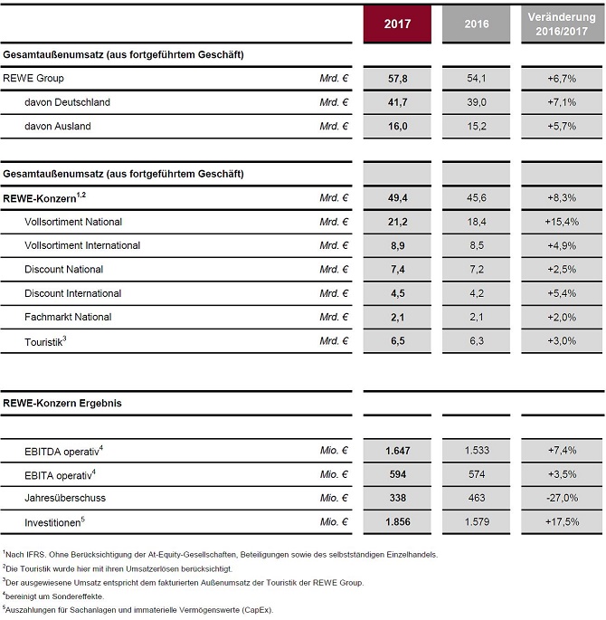 Die REWE Group hat im Geschäftsjahr 2017 beim Umsatz in allen Geschäftsfeldern im In- und Ausland kräftig zugelegt. Der Gesamtaußenumsatz wuchs um 6,7 Prozent auf 57,8 Milliarden Euro. Zum dynamischen Wachstum der Gruppe trug das Geschäft in Deutschland mit einem Umsatzplus von 7,1 Prozent bei. Im Ausland wurde der Umsatz um 5,7 Prozent gesteigert. Der Auslandsanteil am Gesamtaußenumsatz der REWE Group verringerte sich dadurch leicht um -0,3 Prozentpunkte auf 27,7 Prozent; Deutschland: +0,3 Prozentpunkte, auf 72,3 Prozent. Die Zahl der Märkte stieg insgesamt um 3,7 Prozent auf 15.313.